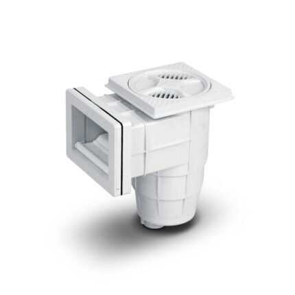 Toma superficial de agua para piscinas de hormigón con boca de 20 cm de ancho y cuello de 235 cm de largo.